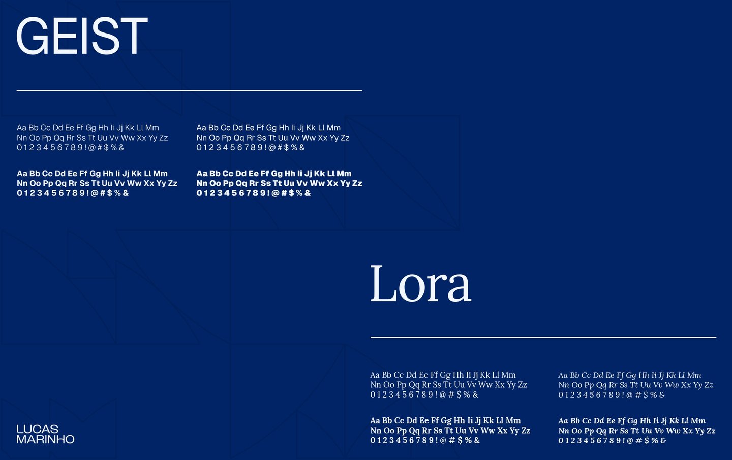 As cores são uma revisão amadurecida sobre tons que o profissional usou em outros momentos. Alguns elementos de apoio nascem dos recortes aplicados na customização da tipografia e ampliam a expressão visual da marca sem adicionar complexidade.