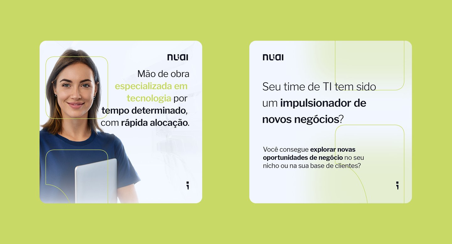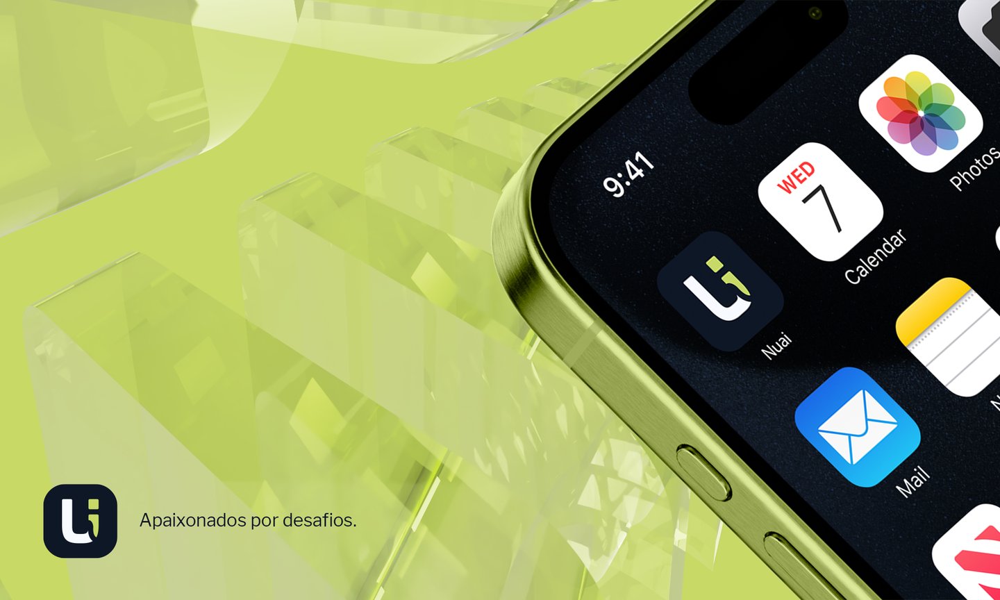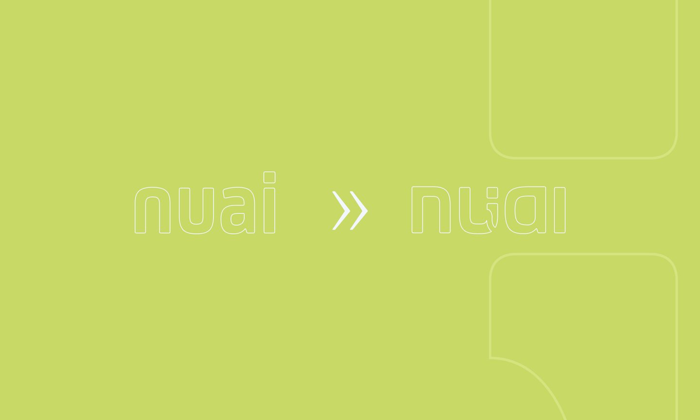 A marca da Nuai carrega um elemento característico no desenvolvimento de softwares, que é o ponto-vírgula, presente em diferentes linguagens de programação. Uma referência ao seu comprometimento com a excelência técnica. Os outros elementos buscam embasar uma marca moderna e profissional, e que é versátil em suas aplicações.