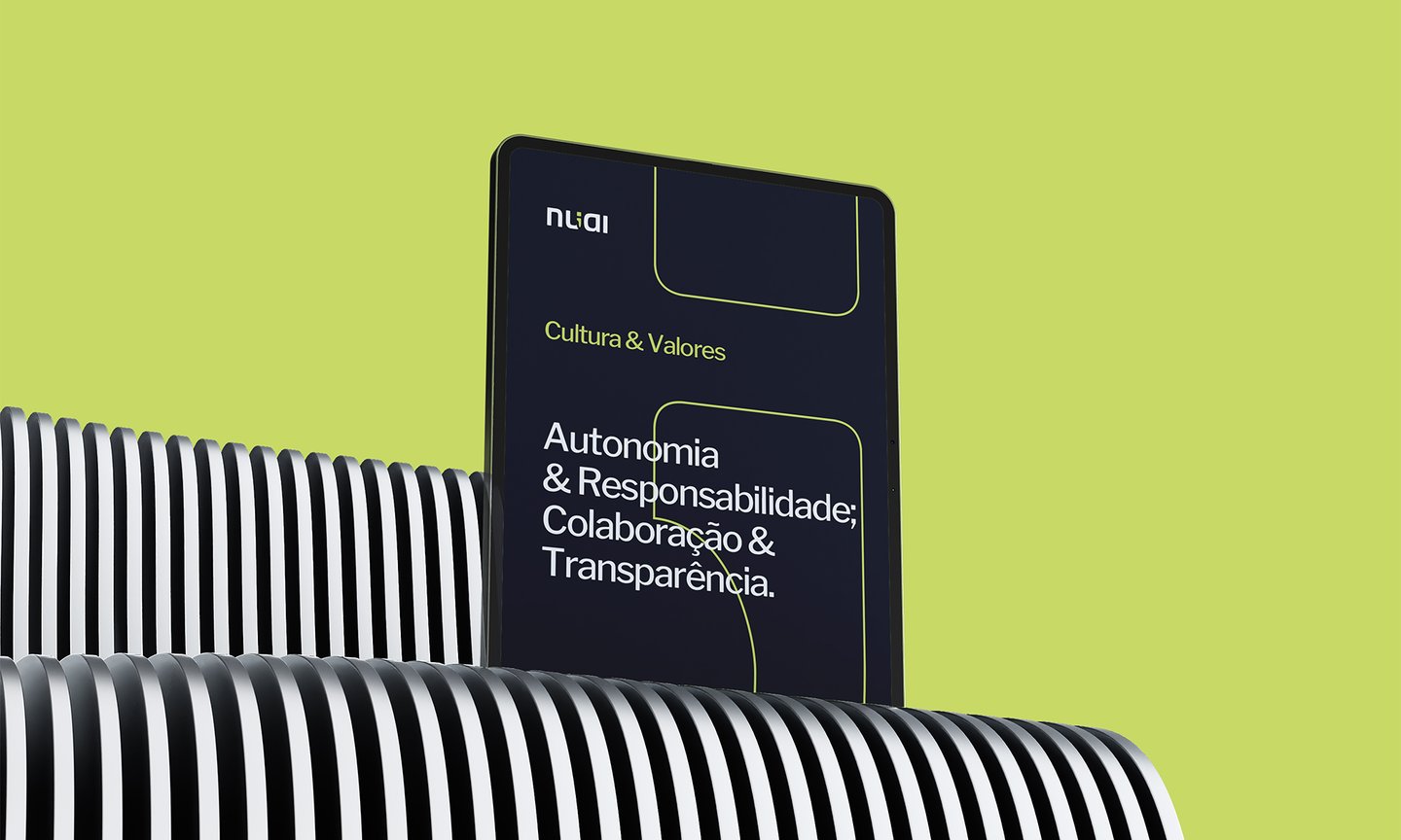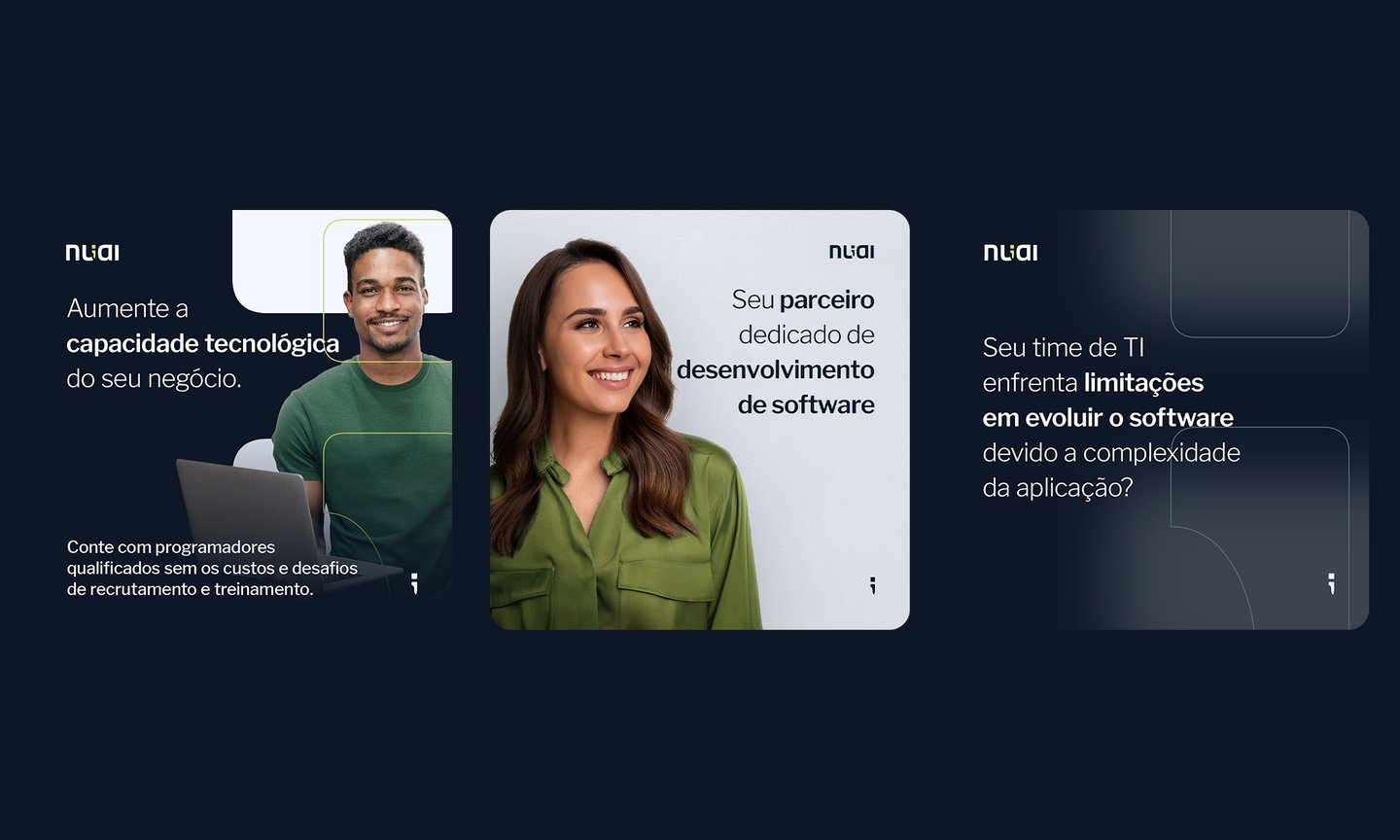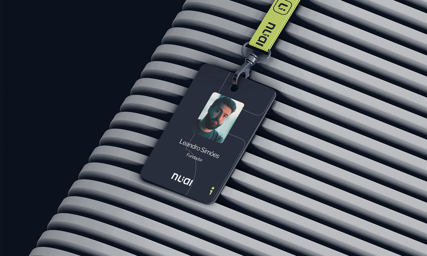 A marca da Nuai carrega um elemento característico no desenvolvimento de softwares, que é o ponto-vírgula, presente em diferentes linguagens de programação. Uma referência ao seu comprometimento com a excelência técnica. Os outros elementos buscam embasar uma marca moderna e profissional, e que é versátil em suas aplicações.